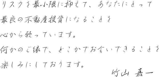 投資不動産業界に入り早30年以上が経ちました。バブルの波に揉まれて苦労した時期もございましたが、周りの人に恵まれて何とかやって参りました。